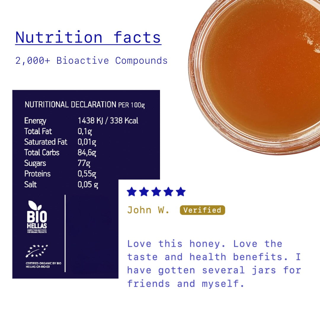 I've tried many Greek honeys, however the quality of this Wildflower thick,rich Ikarian honey surpasses all expectations. There is no finer quality honey around;it not only enhances the many herbal teas that Eleftheria, the owner painstakingly blends together but using it in my baking surpasses the taste, especially in my Baklava,Diples,Finikia and Loukamathes,the list goes on. Delicious over ice cream and absolutely finger dipping is an experience you don't want to miss❣️❣️😋 it's worth splurging and trying a bottle; would love a gallon-sized option,it's that superior in quality and taste😊😊